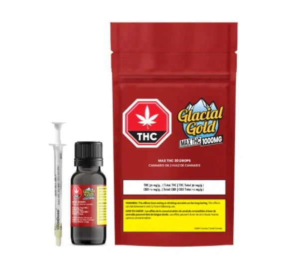 Glacial Gold MAX THC Drops feature high-purity THC distillate mixed with organic MCT oil from coconuts. Their maximum-strength, 30mg/g formula provides 1000mg of THC in every 35ml bottle.