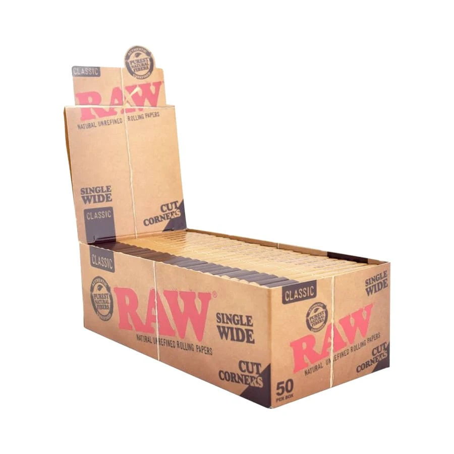 RAW single wide single window rolling papers with cut corners are natural, environmentally friendly. These unbleached rolling papers contains 50 sheets that measure 70mm x 35mm. RAW's cut corners make it easier to roll by hand or with a machine, and offer a slow even burn. RAW papers feature their signature criss-cross steam imprinted RAW watermark.