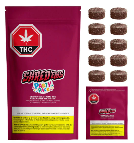 SHRED’ems Cherry Cola Party Pack has 10 packs of MAX10 gummies, each with 10mg THC – for a total 100mg THC per pack! These indica-dominant gummies are bubbling with the perfect mouth-watering combo of sweet cherry and classic cola flavours. To cap it all off these soda all-stars are vegan-friendly and made with all-natural flavours.